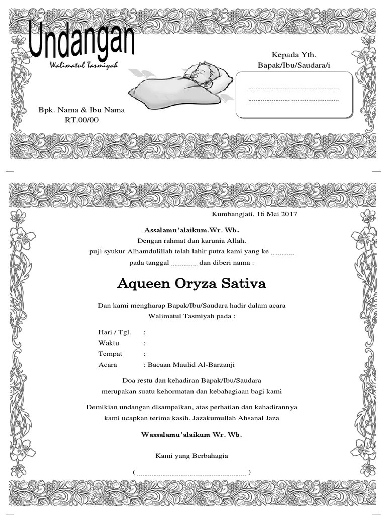 Undangan aqiqah adalah media pemberitahuan kepada orang yang diundang atas acara tasyakuran atau syukuran kelahiran anak yang akan .